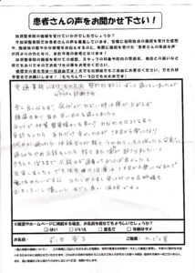 先生の施術の後は、肩や首がとても軽くなり、頭痛もなくなりました。また、通ってるうちに、だんだんと痛みも感じなくなり、気持ち良く施術を受けられます。感謝しております。