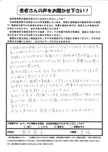 仕事が車の運転なので、ムチウチが良くなった時は本当に先生におまかせして良かったと思います。この調子で肩こりも改善出来るようにしたいです。