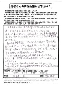 今ではしびれも治り、夜遅くに行っても「よく来れましたねー。」と明るい笑顔で迎えてくれます。暖かい皆様に感謝してます。