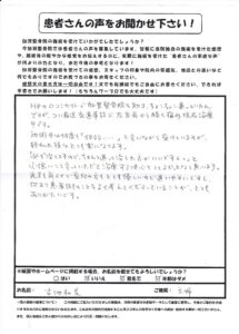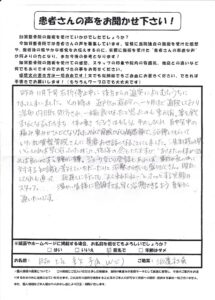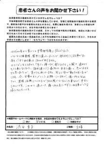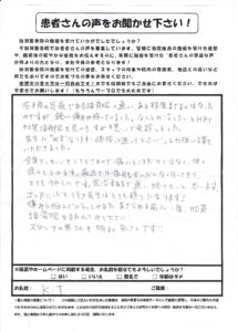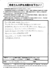 最初は「本当に治していただけるのか」と不安が抜けず、半信半疑でしたが、先生から「大丈夫。治りますよ。」と心強い言葉をいただき、電気治療だけでない丁寧な手技により痛みがなくなり、根本から治していただいたのを強く感じております。